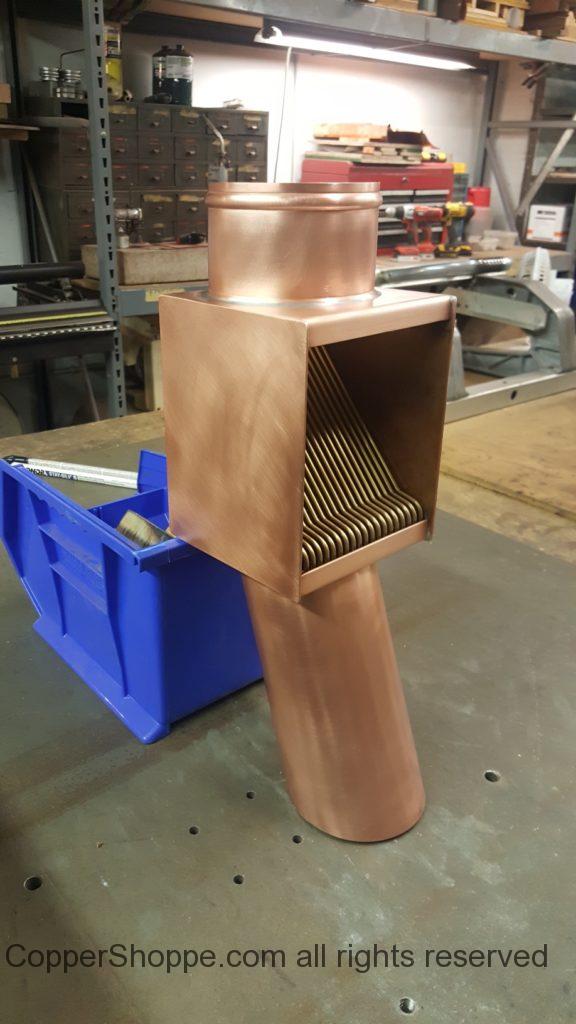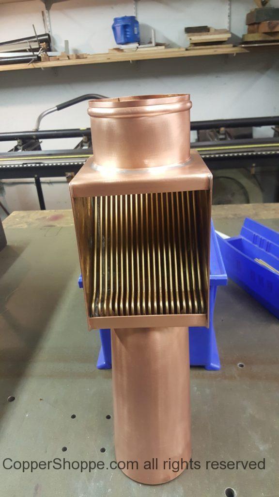 AutoClear Brasstonian Copper Downspout Leaf and Debris Diverter Cleanout with custom extended and angled outlet