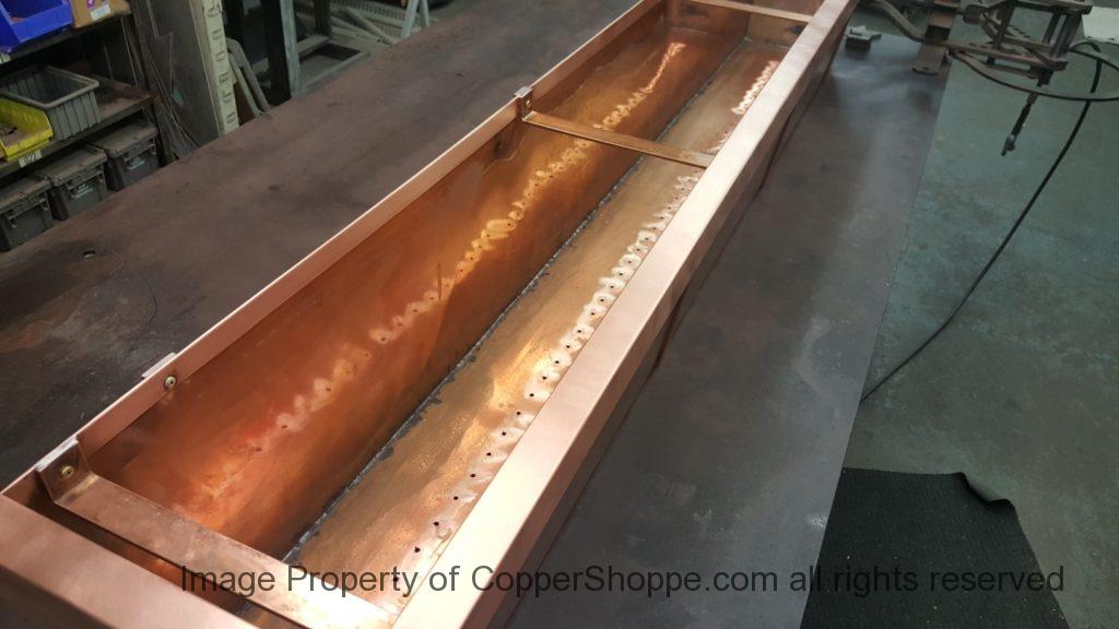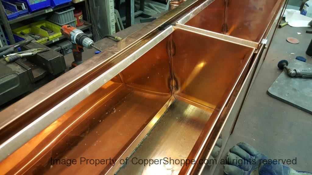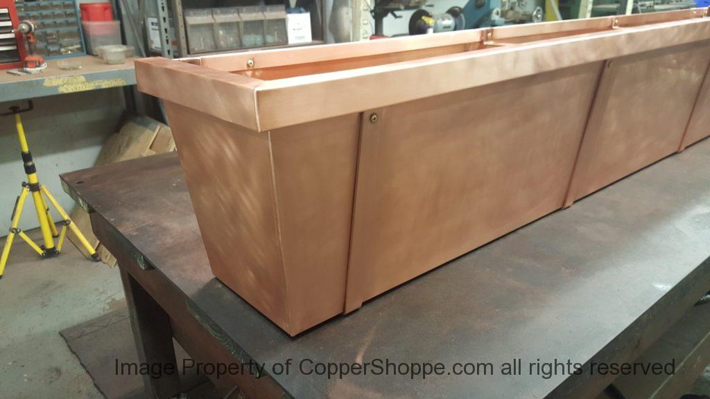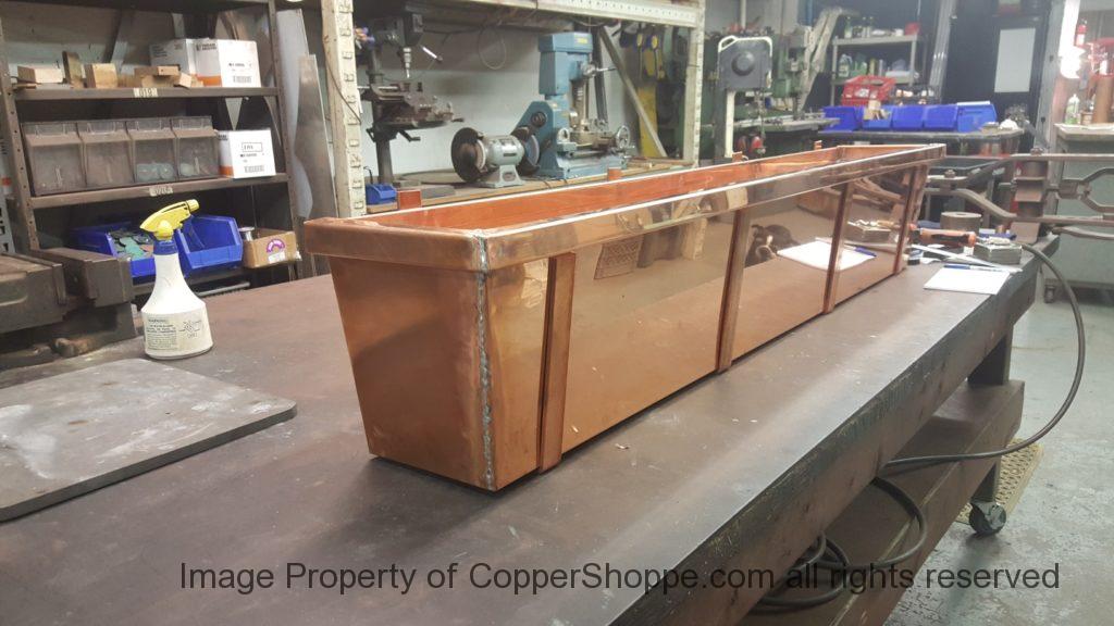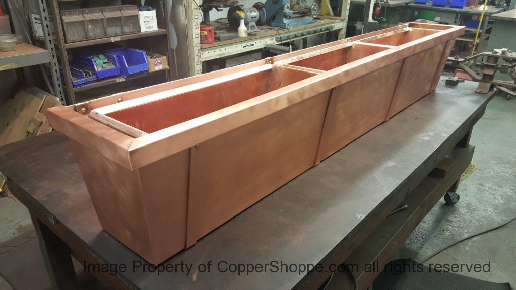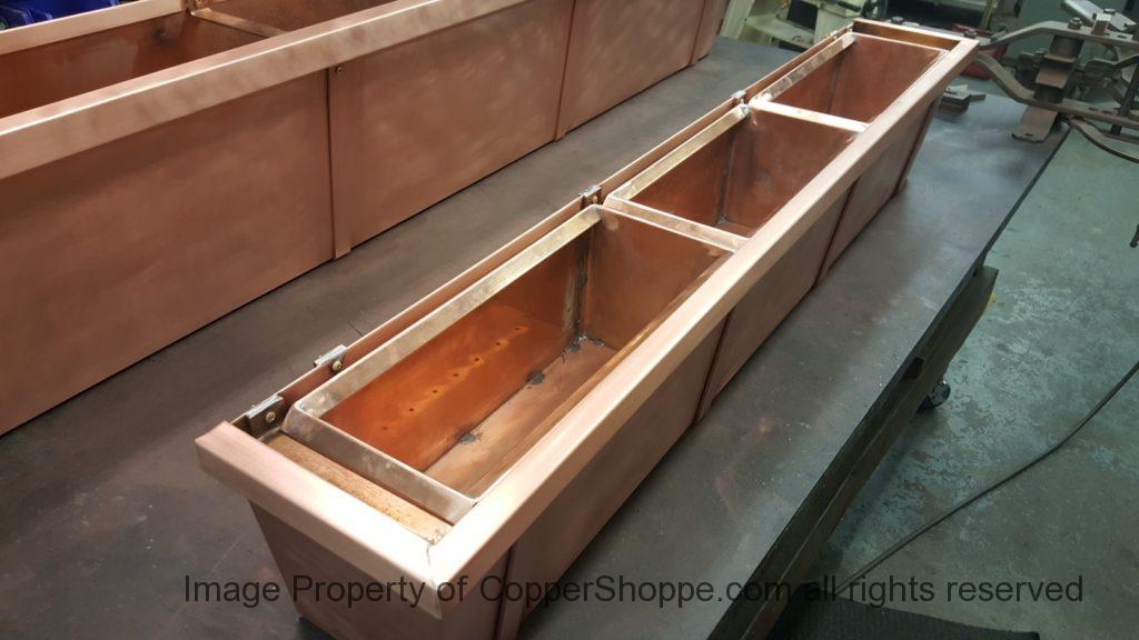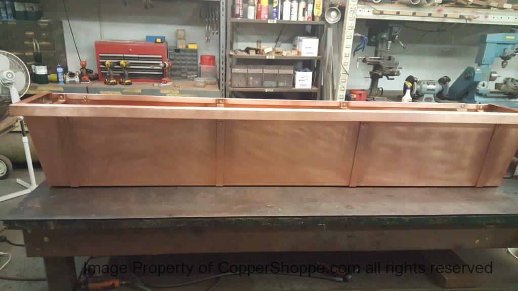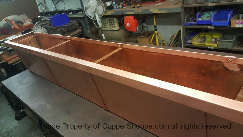 I am interested in having you build a copper planter insert to go in the space at the top of my bookcase with the interior dimensions of approximately 8.35” in width, 58.25” in length and 5.25” in depth, surrounded by a .75” wooden border that I would like to have covered with the copper and extending down the outside of the bookcase for a few inches.