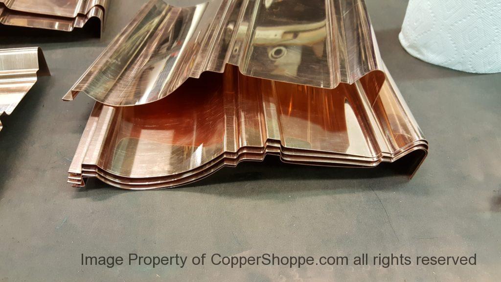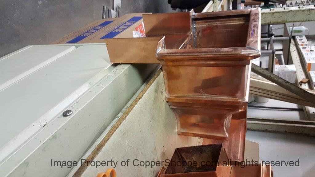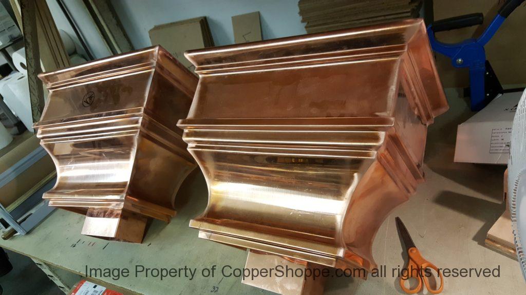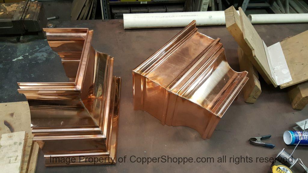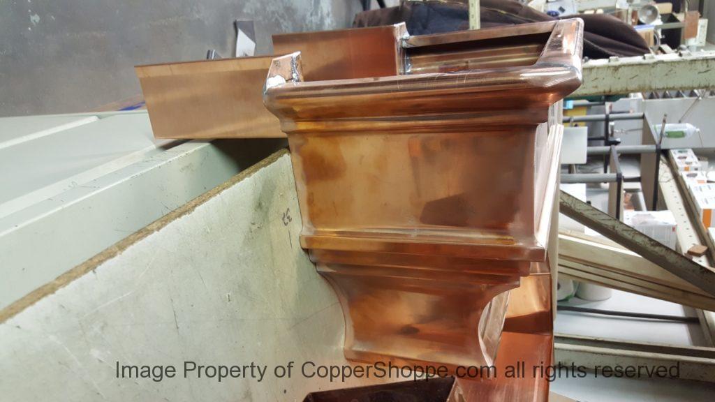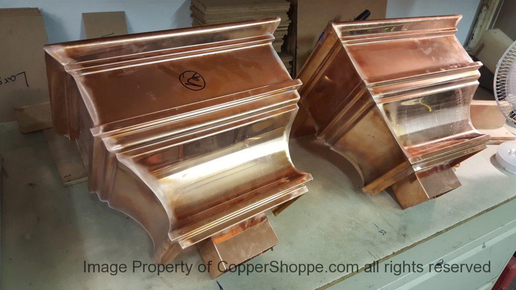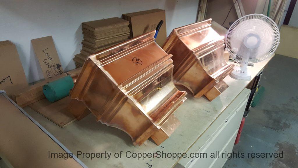 These Leader Heads are 18″ wide by 10″ deep and 14″ tall. They will have a Scupper Trough attached to the back that will be 8″ long. The order calls for 5 but they want 2 ASAP. Started this from scratch on Tuesday. So all new design work to figure out the blanks. New Fixtures to cut and miter the blanks. Moving along pretty good for all aspects. This profile is about 2-1/2″ taller than the Original Nemours…and we really like the new look.