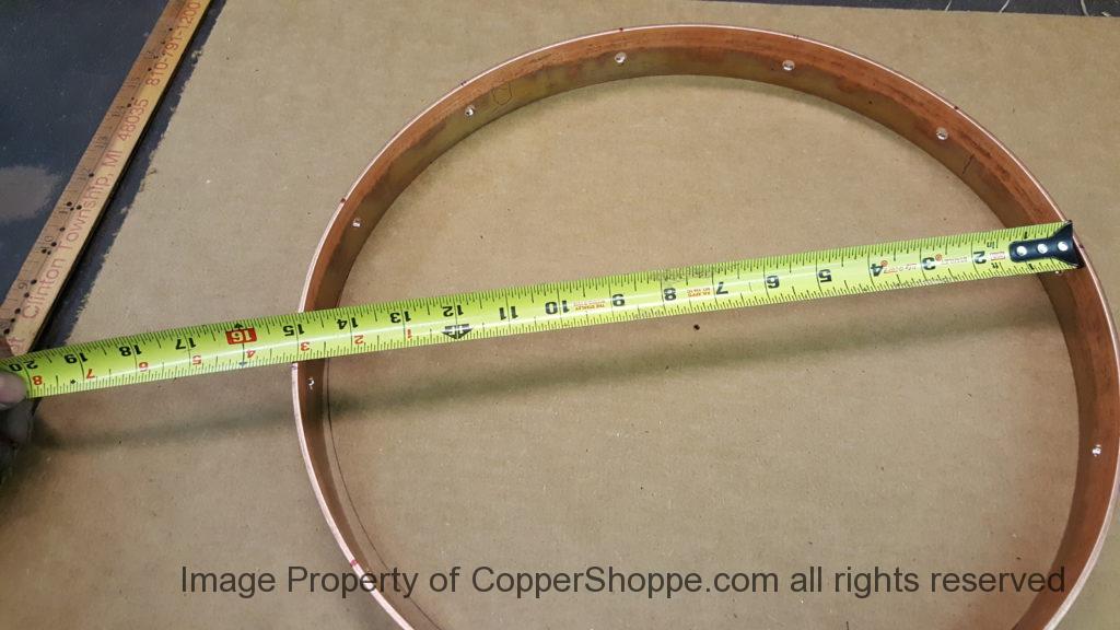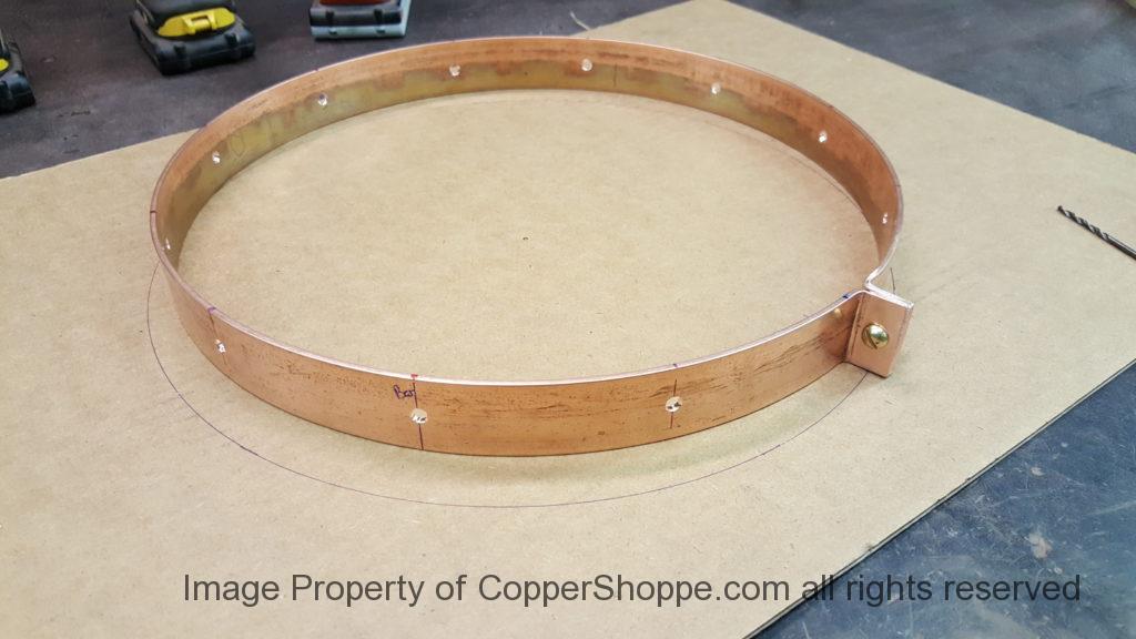 Started work on the Base. We are right on the number (15″) for the interior diameter of the Base. All holes have been drilled for the uprights and fastening bolts. Notice that the holes have been chamfered. You will not see this chamfer work on the finished unit but good work habits are hard to break and actually the chamfer will help us for assembly etc. as we do mock up and such to set the final height. We are looking for just under 6″ of exposed screening area.