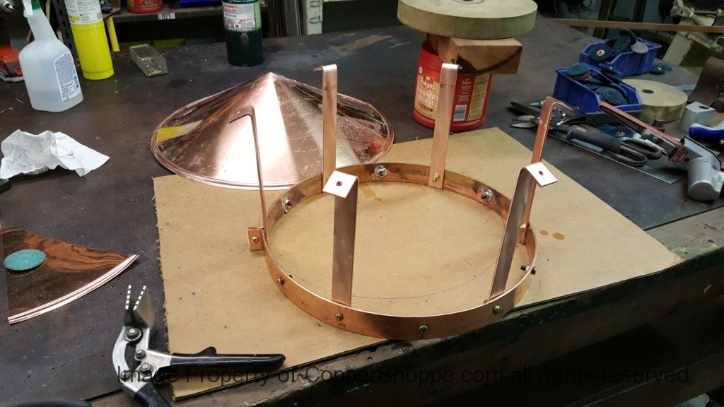 Dome Cap is done. We also did the uprights that would hold the Dome Cap above the Base Ring. Actually the screening is installed already and the unit is final assembled. Will post up a few pictures of it tomorrow. Notice that for the installation of the Uprights (picture 2) the Base Ring was moved off the Main Fabrication Bench and put on the Welding / Fixture Table. That Table is 1″ thick Aluminum that is perfectly flat. This way we get true reading when we square up from the surface to align the uprights. The Wooden Fabrication Bench is good for 95 percent of what we do but as circumstances require we move to the Welding / Fixture Table to make sure things are perfect.