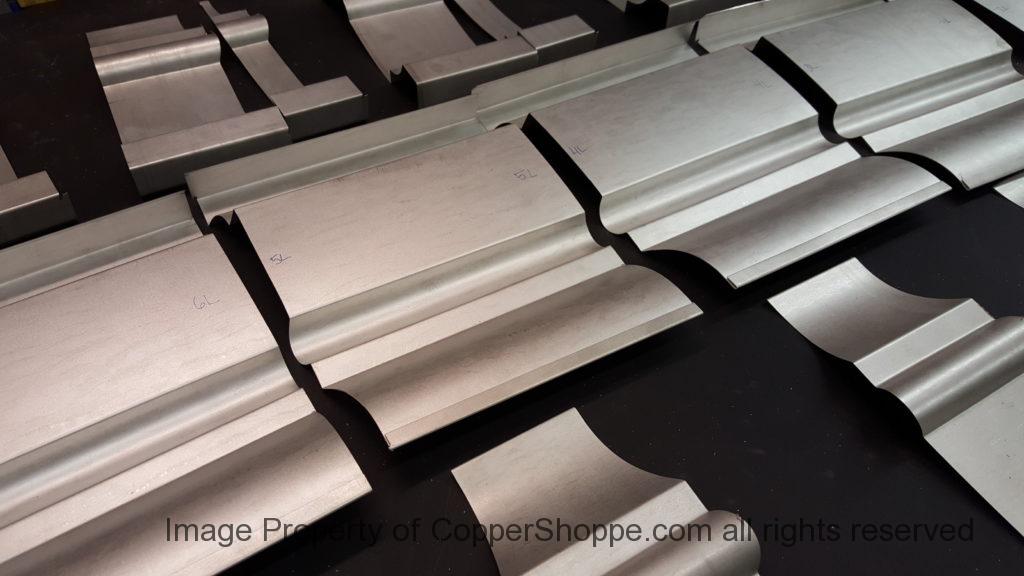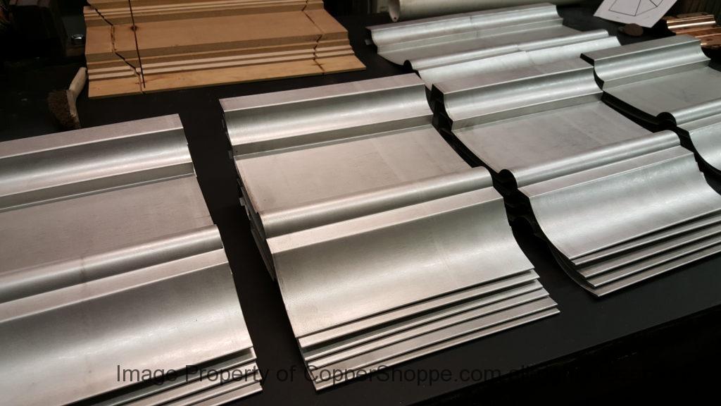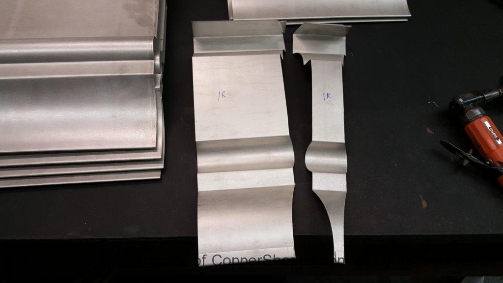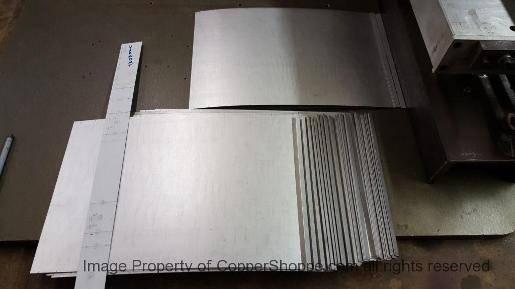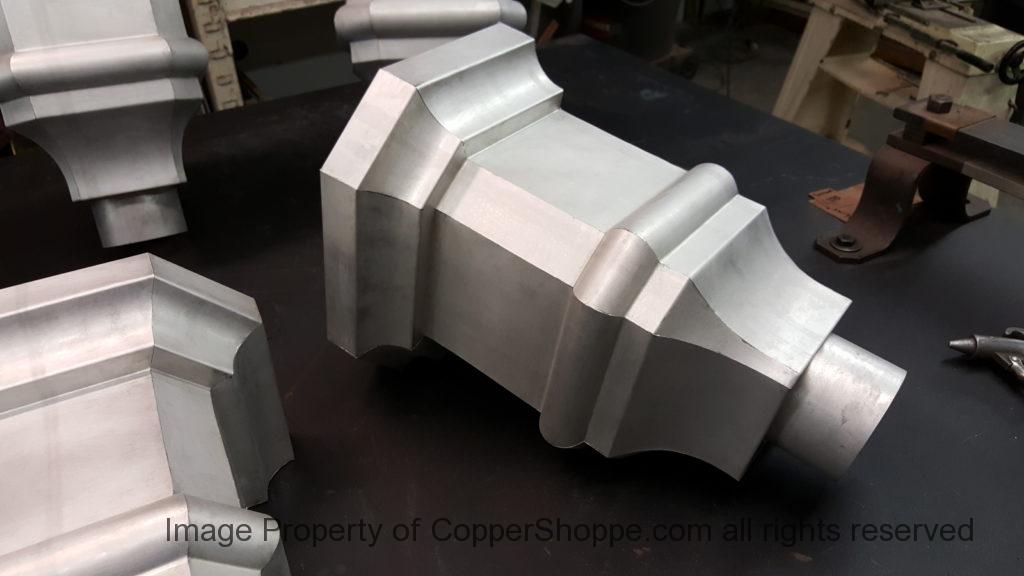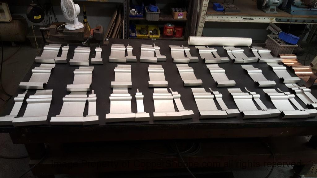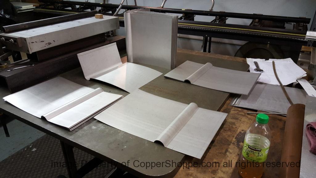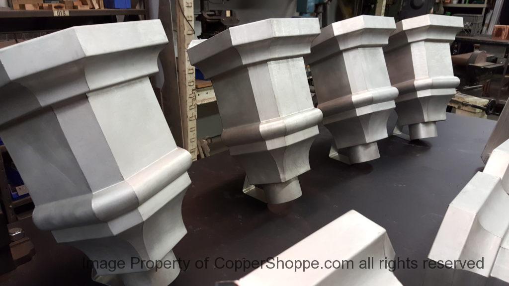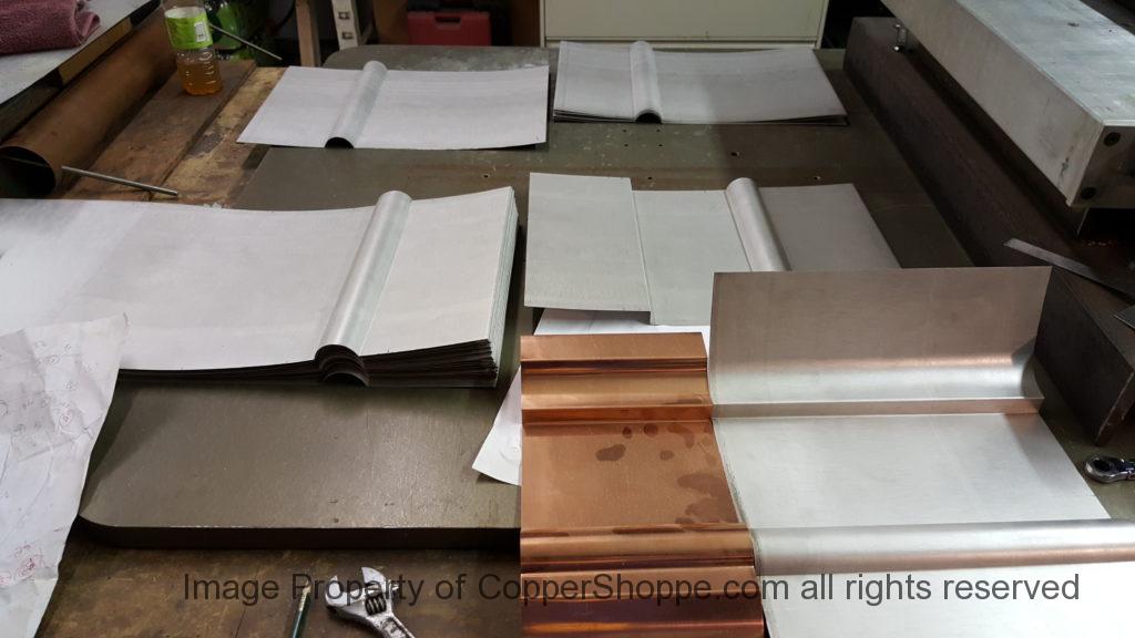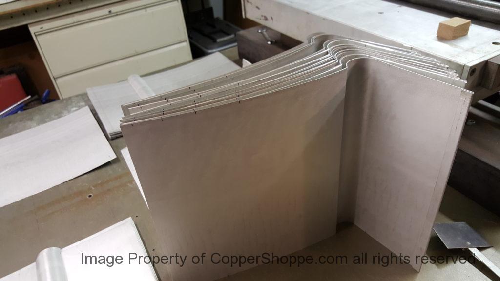 This will be a little tricky. We cleaned the shop up real good to prepare for running this job. Don’t want any contaminants on the benches or any metal shavings as Freedom Gray is a non forgiving material. Job at this point has been blanked, marked for bend and radius points and in first round of bends on our main brake. It will require 3 of our brakes to accomplish the job. Our main brake, our project brake and our own custom designed and self built radius brake. Also this will be a new 5 Sided Profile for the Yarmont. Normally the Yarmont has 3 Sides or sections – Left -Front – and Right. This will have a Left – a Facet – Front – a Facet – and then the Right for a total of 5 Sections to complete the profile. We have a width restriction of 12 inches to make these work and did some preliminary CAD work to make sure we were on the right track. We did a CAD Rendering of the Leader Box also just to make sure we had things how the customer wanted. This process to get to the actual job award took a few months as meetings had to be attended by the customer, builder, contractor and the architect. The customer actually bought a Leader Box in Copper so he could see the craftsmanship of construction. Lots of hurdles to cross but seems like everyone wants to make sure they are getting the best quality product available for the project.