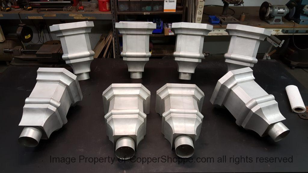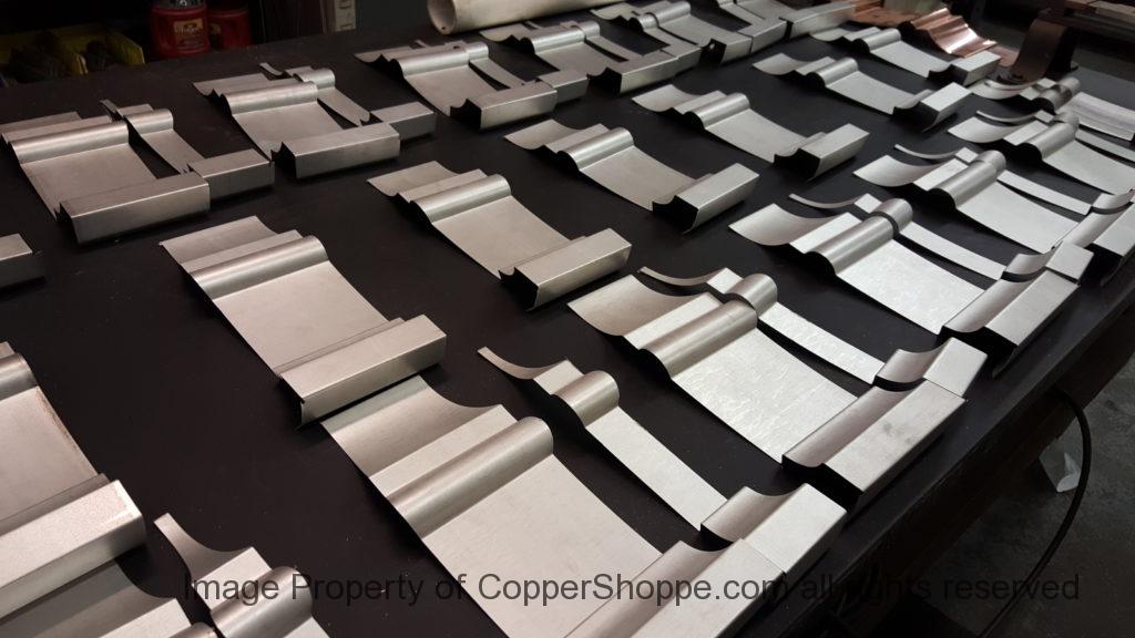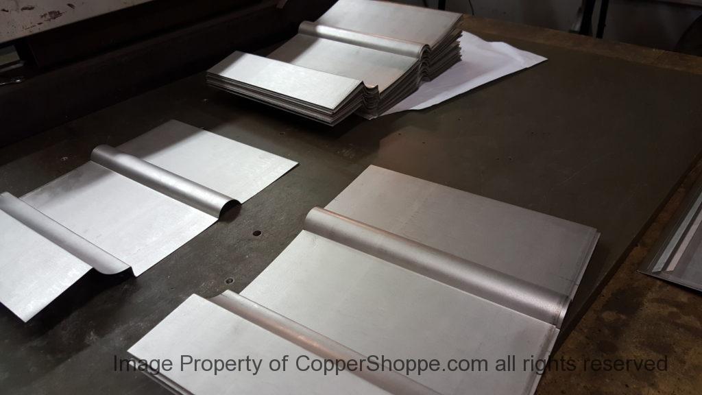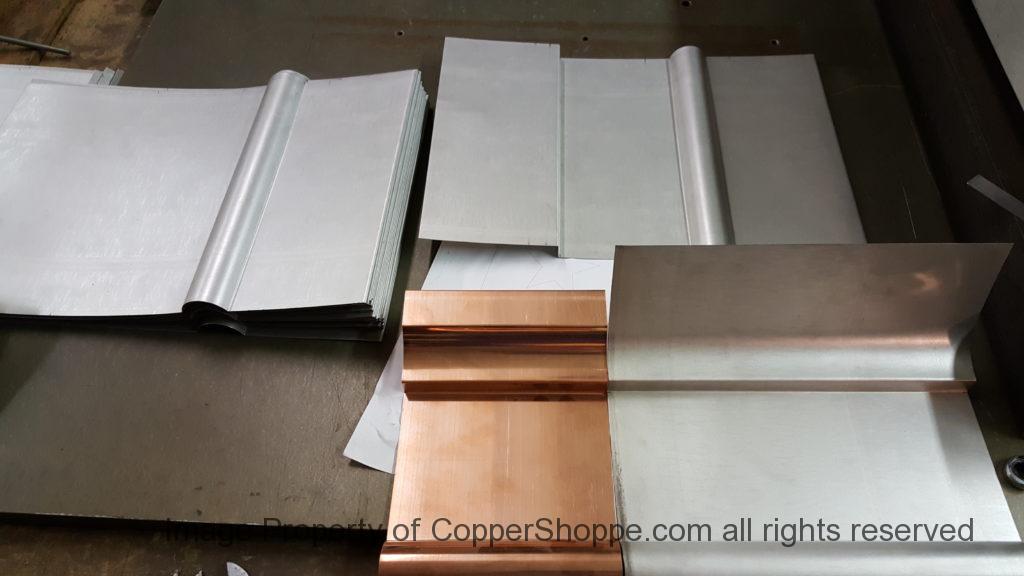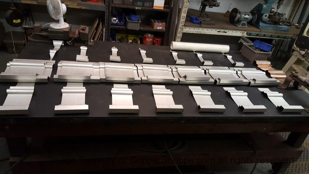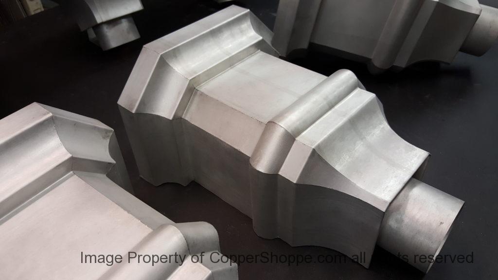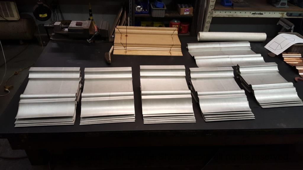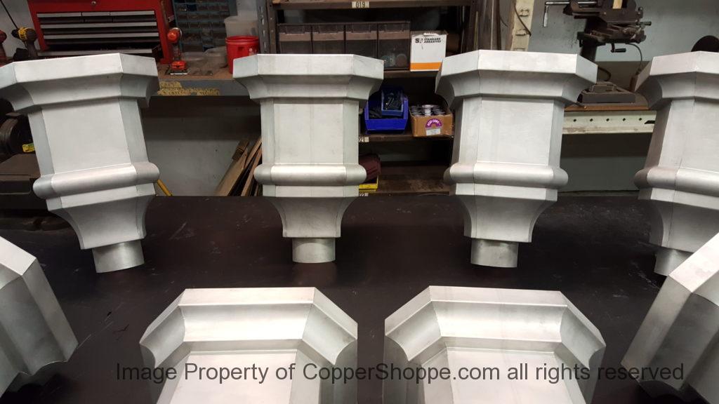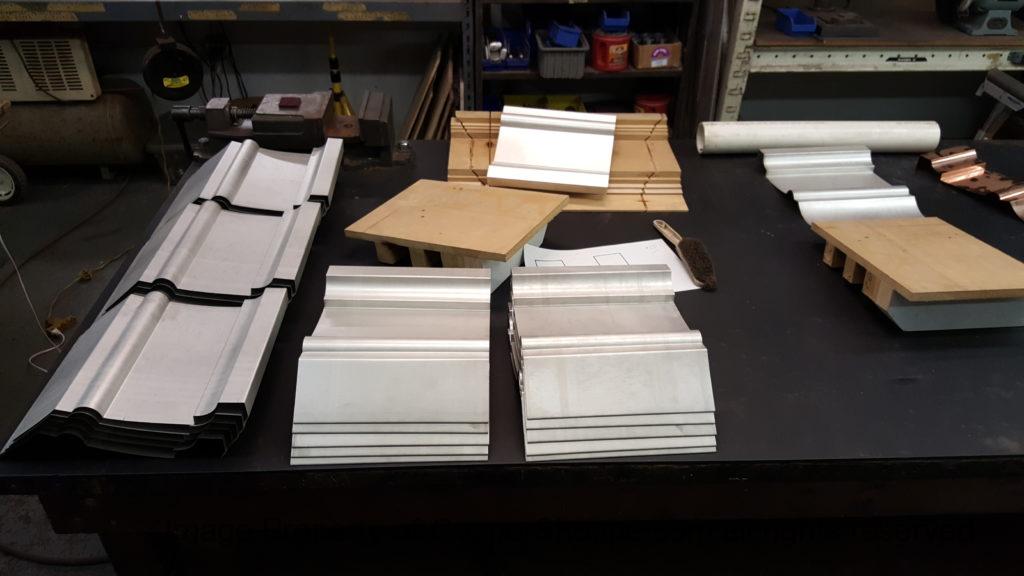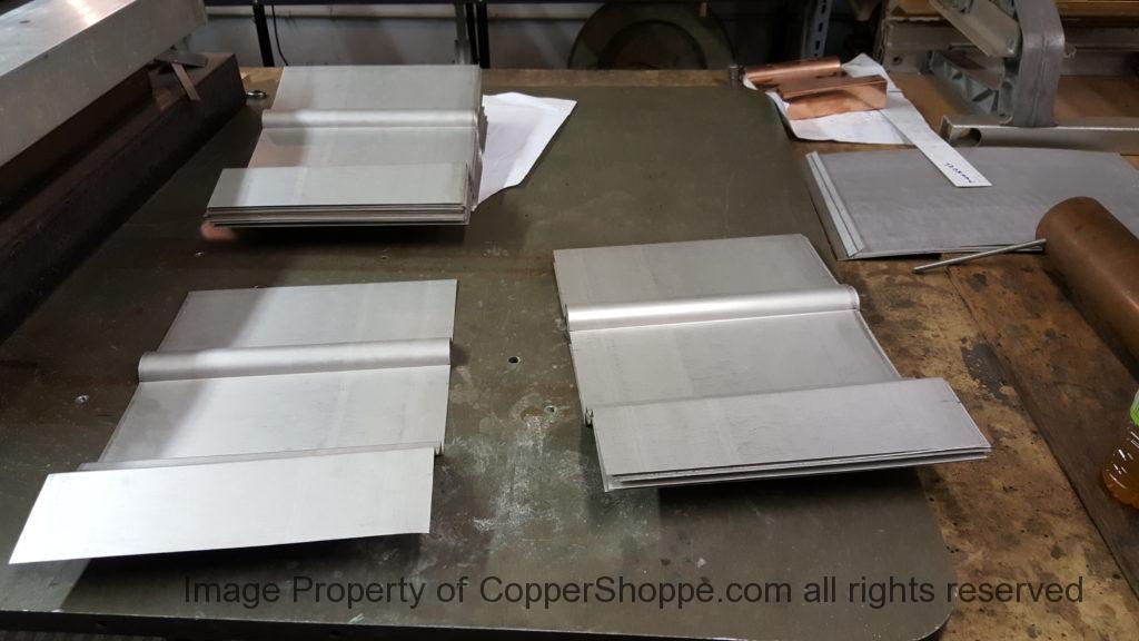 This will be a little tricky. We cleaned the shop up real good to prepare for running this job. Don’t want any contaminants on the benches or any metal shavings as Freedom Gray is a non forgiving material. Job at this point has been blanked, marked for bend and radius points and in first round of bends on our main brake. It will require 3 of our brakes to accomplish the job. Our main brake, our project brake and our own custom designed and self built radius brake. Also this will be a new 5 Sided Profile for the Yarmont. Normally the Yarmont has 3 Sides or sections – Left -Front – and Right. This will have a Left – a Facet – Front – a Facet – and then the Right for a total of 5 Sections to complete the profile. We have a width restriction of 12 inches to make these work and did some preliminary CAD work to make sure we were on the right track. We did a CAD Rendering of the Leader Box also just to make sure we had things how the customer wanted. This process to get to the actual job award took a few months as meetings had to be attended by the customer, builder, contractor and the architect. The customer actually bought a Leader Box in Copper so he could see the craftsmanship of construction. Lots of hurdles to cross but seems like everyone wants to make sure they are getting the best quality product available for the project.