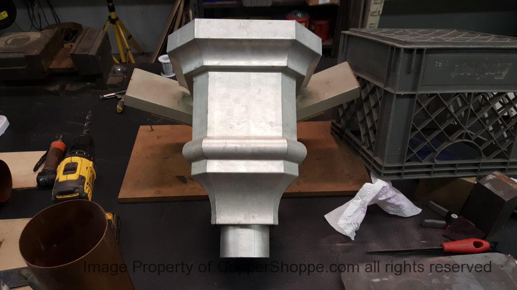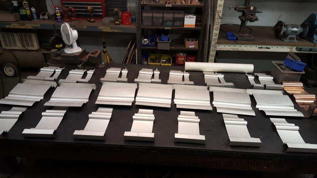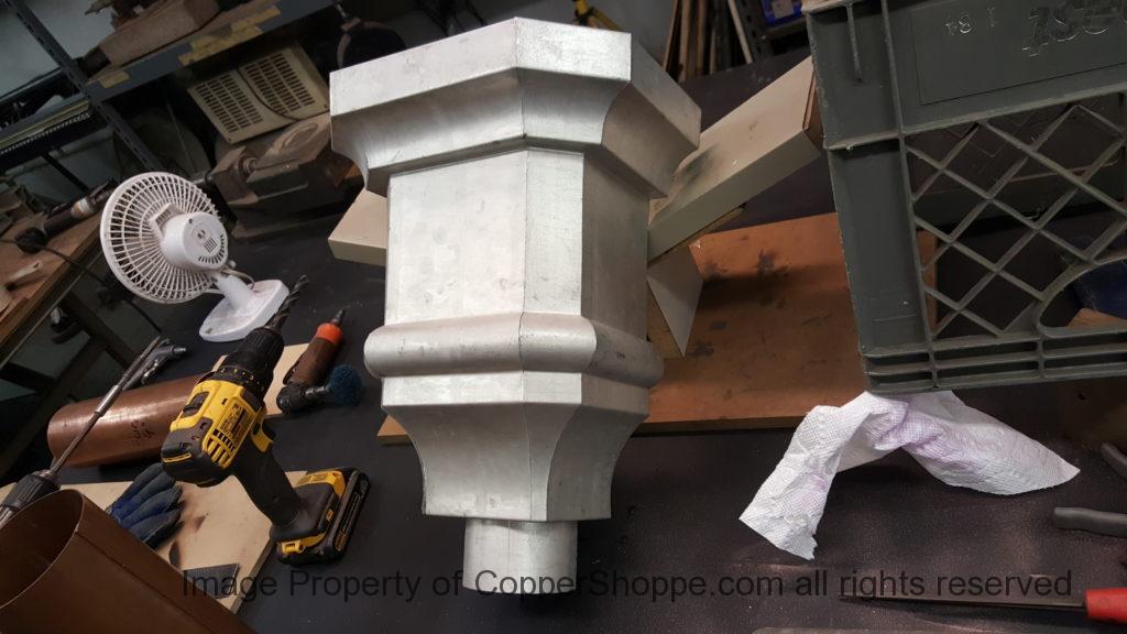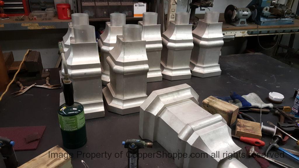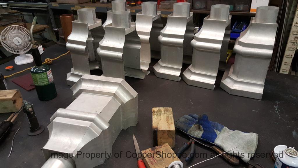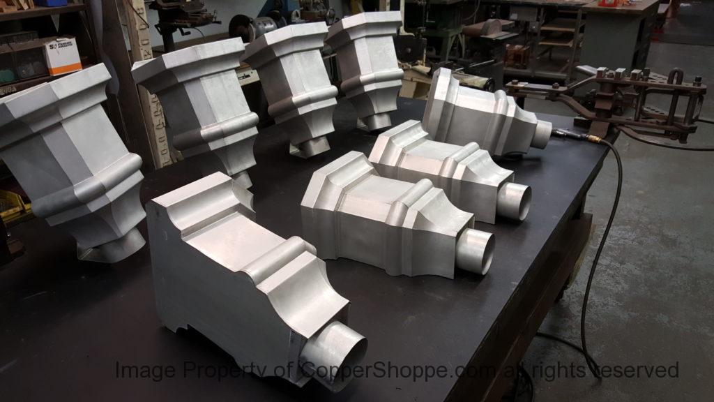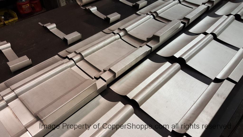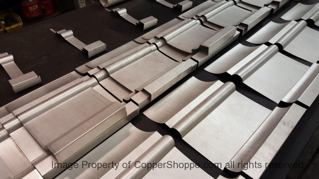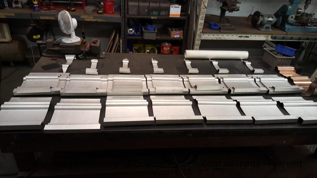 This will be a little tricky. We cleaned the shop up real good to prepare for running this job. Don’t want any contaminants on the benches or any metal shavings as Freedom Gray is a non forgiving material. Job at this point has been blanked, marked for bend and radius points and in first round of bends on our main brake. It will require 3 of our brakes to accomplish the job. Our main brake, our project brake and our own custom designed and self built radius brake. Also this will be a new 5 Sided Profile for the Yarmont. Normally the Yarmont has 3 Sides or sections – Left -Front – and Right. This will have a Left – a Facet – Front – a Facet – and then the Right for a total of 5 Sections to complete the profile. We have a width restriction of 12 inches to make these work and did some preliminary CAD work to make sure we were on the right track. We did a CAD Rendering of the Leader Box also just to make sure we had things how the customer wanted. This process to get to the actual job award took a few months as meetings had to be attended by the customer, builder, contractor and the architect. The customer actually bought a Leader Box in Copper so he could see the craftsmanship of construction. Lots of hurdles to cross but seems like everyone wants to make sure they are getting the best quality product available for the project.