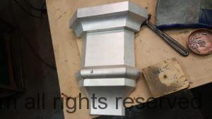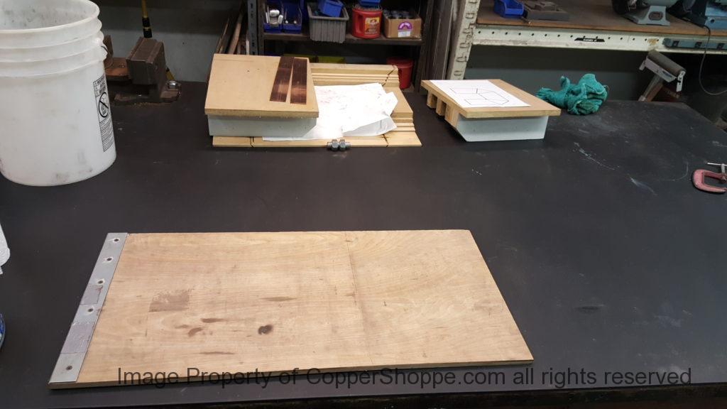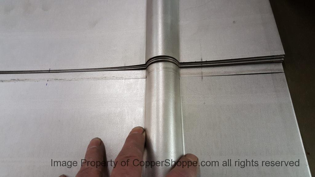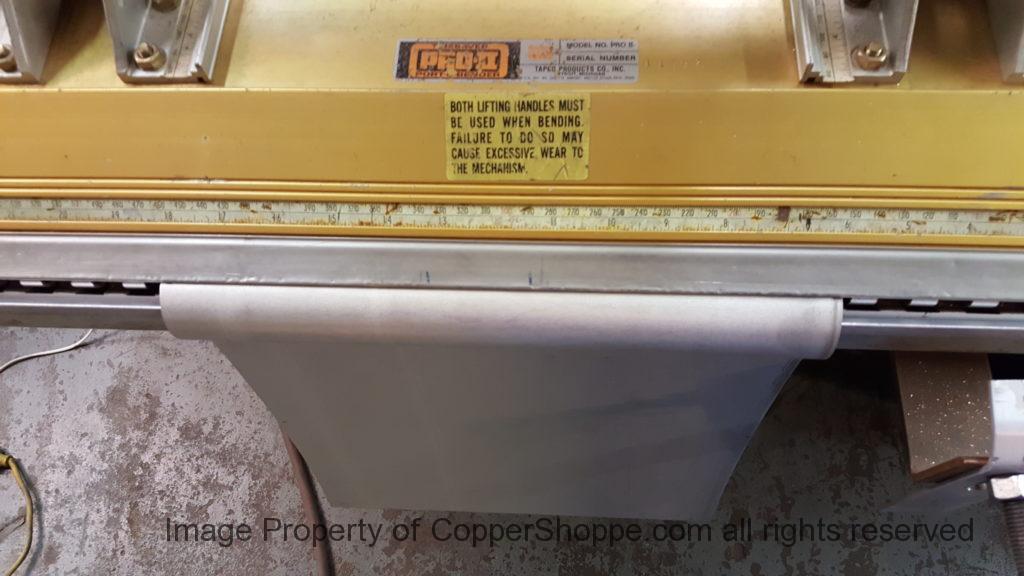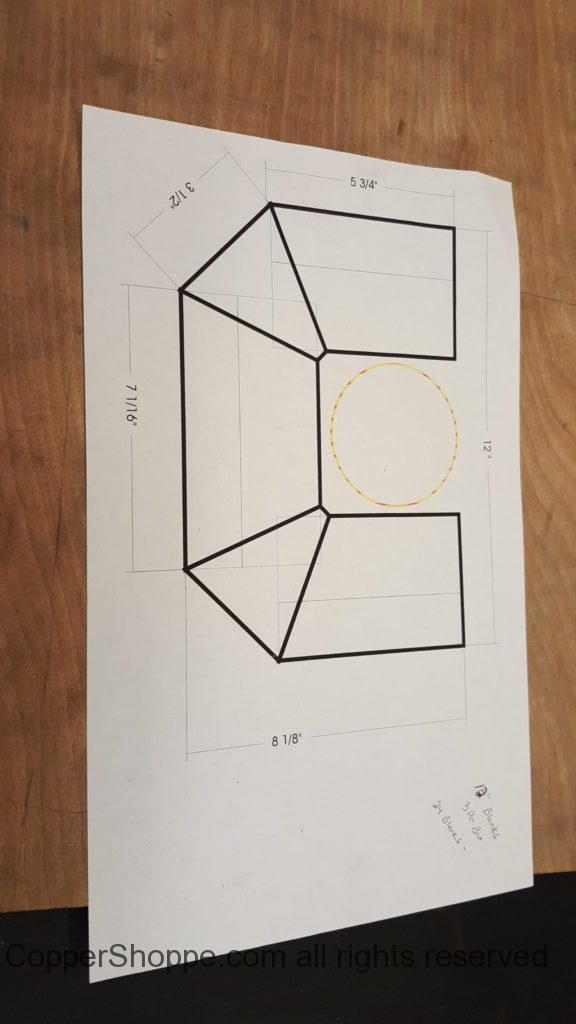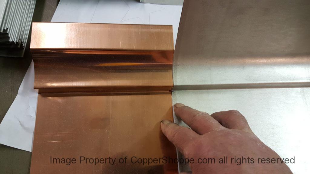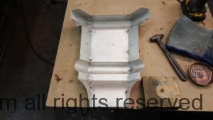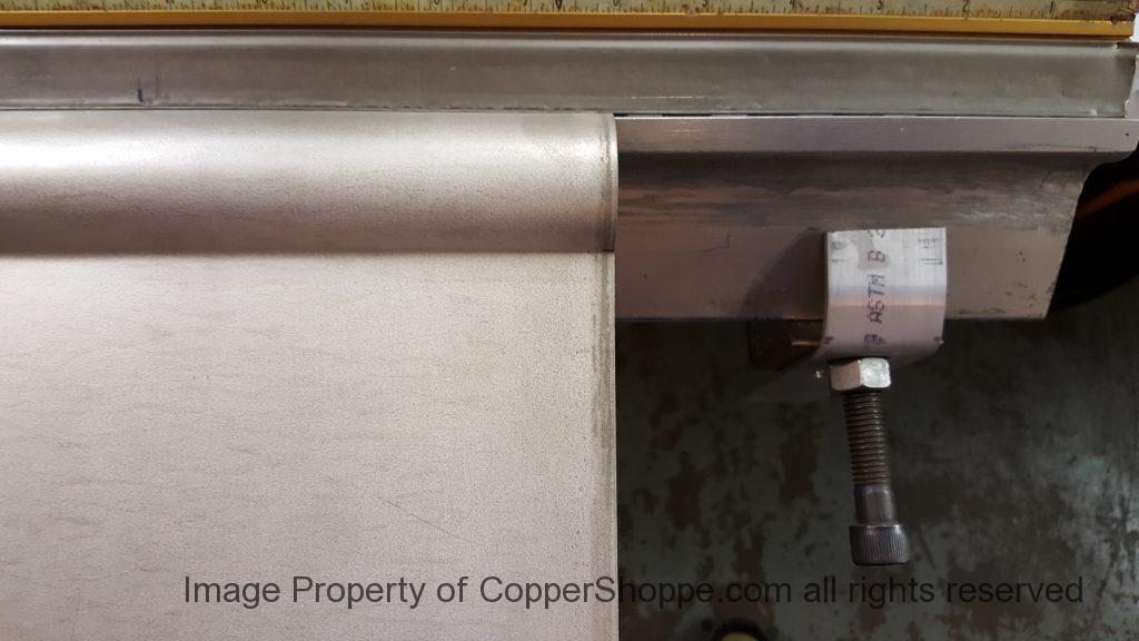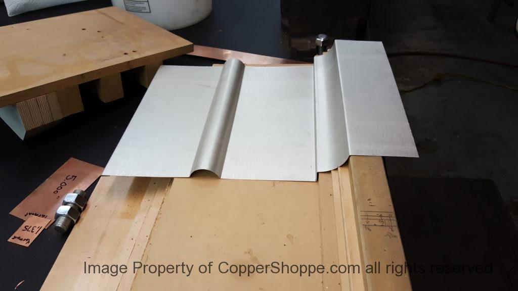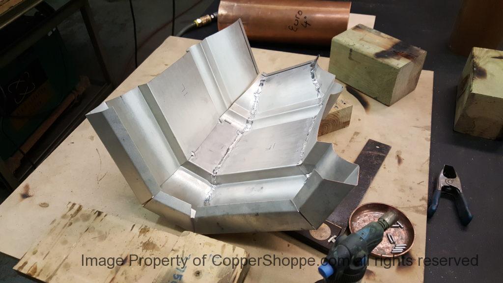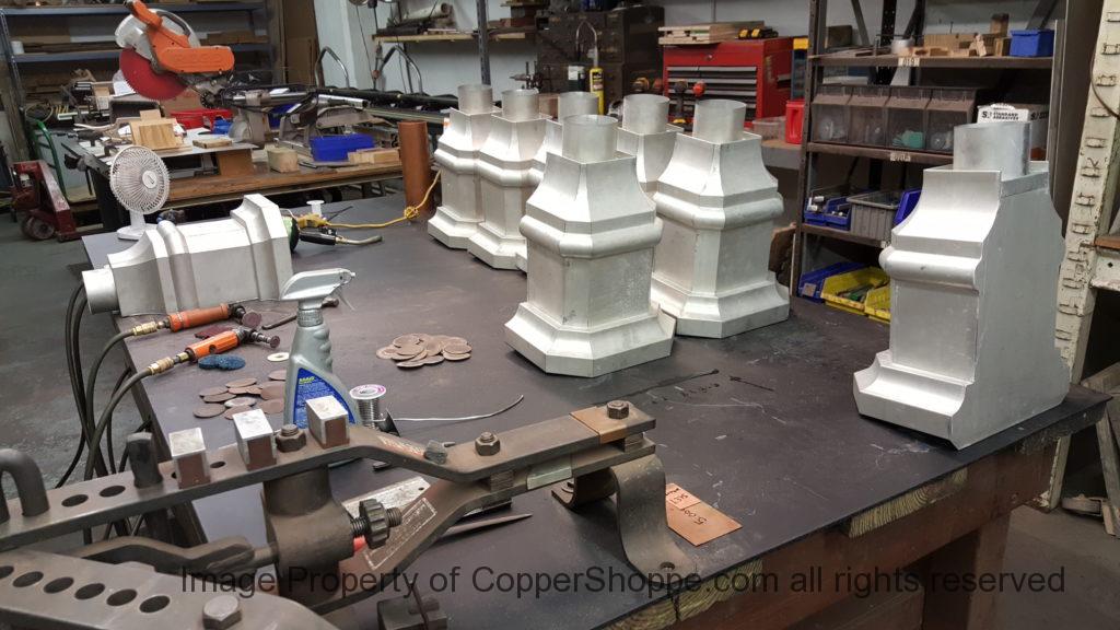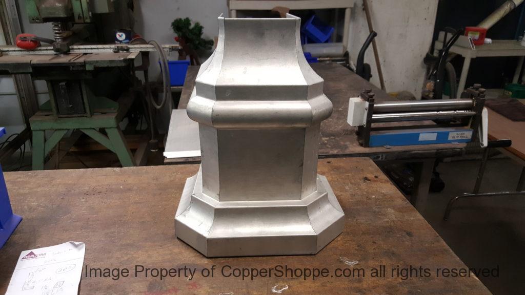 This will be a little tricky. We cleaned the shop up real good to prepare for running this job. Don’t want any contaminants on the benches or any metal shavings as Freedom Gray is a non forgiving material. Job at this point has been blanked, marked for bend and radius points and in first round of bends on our main brake. It will require 3 of our brakes to accomplish the job. Our main brake, our project brake and our own custom designed and self built radius brake. Also this will be a new 5 Sided Profile for the Yarmont. Normally the Yarmont has 3 Sides or sections – Left -Front – and Right. This will have a Left – a Facet – Front – a Facet – and then the Right for a total of 5 Sections to complete the profile. We have a width restriction of 12 inches to make these work and did some preliminary CAD work to make sure we were on the right track. We did a CAD Rendering of the Leader Box also just to make sure we had things how the customer wanted. This process to get to the actual job award took a few months as meetings had to be attended by the customer, builder, contractor and the architect. The customer actually bought a Leader Box in Copper so he could see the craftsmanship of construction. Lots of hurdles to cross but seems like everyone wants to make sure they are getting the best quality product available for the project.