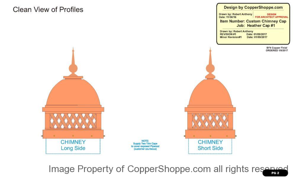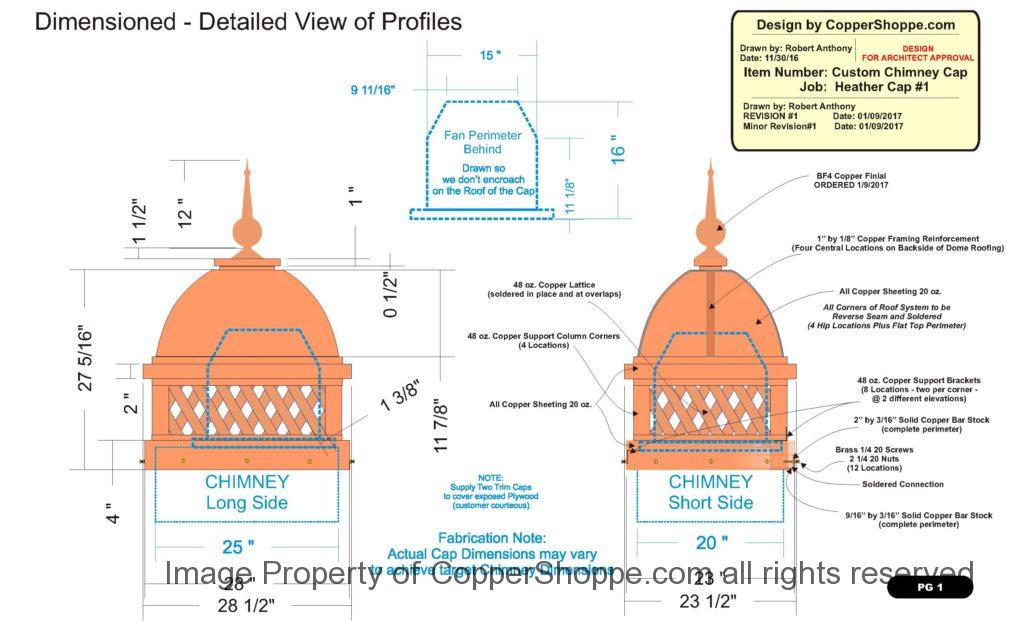 This Chimney Cap is made out of 20 oz. Copper for most of the construction. 48 oz. Copper was used for the Corner Posts and Lattice work. The Spire / Finial is 20 oz. Copper.
