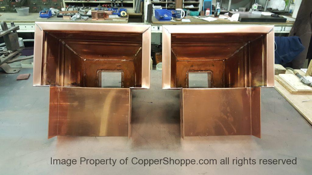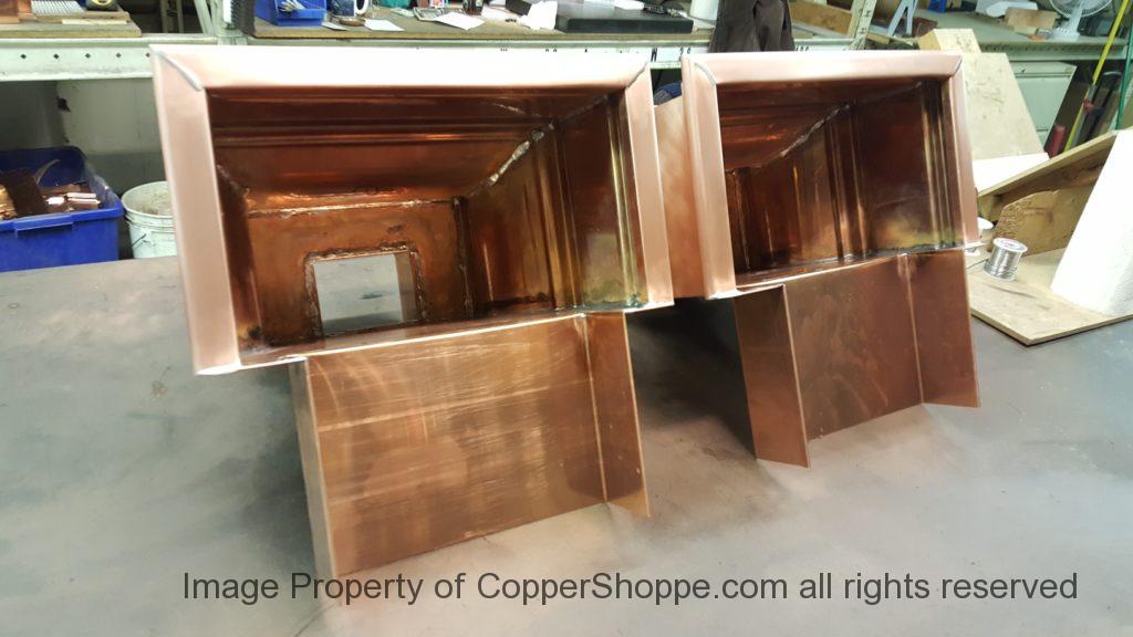 First Two of Five for the Project. These are 18″ wide by 10″ deep by 14″ tall. The Scupper Trough entering the box is 12″ wide by 3-5/16″ tall by 8″ long.