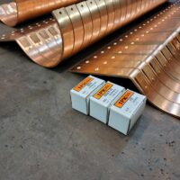 Roof Mount Copper Gutter Brackets Hangers. These were special in a couple of ways. Customer wanted the first hole 1-1/4″ further back than normal. Plus they were at 7.5 / 12 roof pitch.